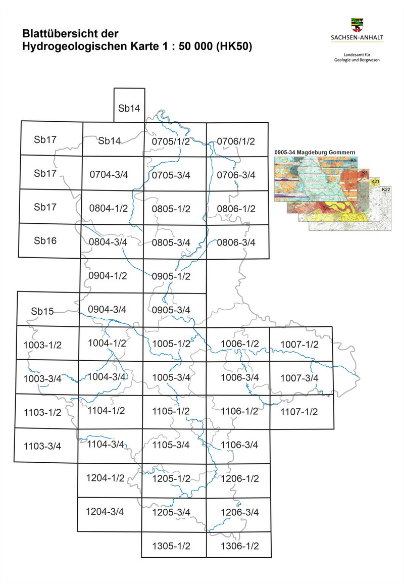 Für das Gebiet der neuen Bundesländer liegt flächendeckend eine hydrogeologische Kartierung im Maßstab 1:50.000 vor (HK 50; Bearbeitungszeitraum 1979-1984). Das analog vorliegende Kartenwerk enthält folgende Kartenebenen: